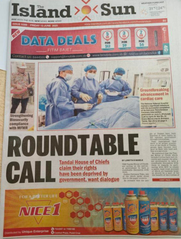 近日,中国援所医疗队在中国援建的所罗门群岛国家转诊医院综合医疗中心(CMC)心血管导管室成功为一名当地患者实施了微创冠状动脉介入治疗,标志着所在心血管疾病介入治疗方面取得了历史性突破。6月13日,所方媒体太阳报头版头条以《心血管疾病治疗突破性进展》为题、所罗门卫生部官方媒体以《所罗门首例,心血管疾病治疗里程碑式创举与突破性进展》为题,分别对该手术进行了报道。
